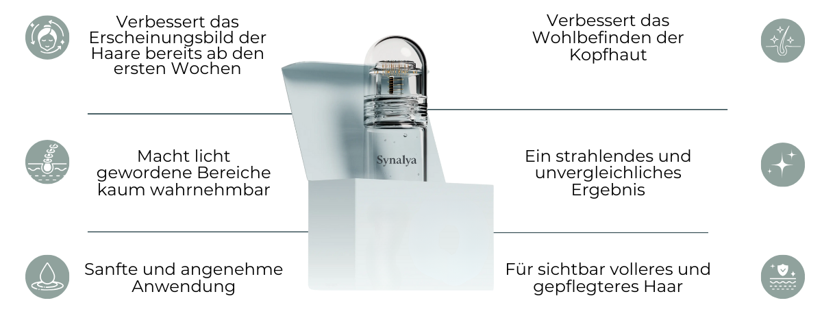 Dickeres Haar und gestoppter Haarausfall innerhalb weniger Wochen! Synalya stimuliert das Haarwachstum und revitalisiert ruhende Haarfollikel dank seiner patentierten Mikroinfusionstechnologie.